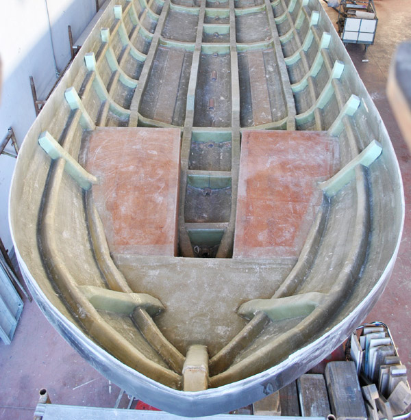 Effettuiamo un controllo continuo durante tutta la stratificazione affinchè si rispettino tutti gli spessori ed i rinforzi necessari e richiesti per questo tipo di imbarcazioni. Internamente al fasciame abbiamo una ramificazione di longitudinali e correnti che creano una struttura robusta ed idonea al lavoro più arduo.
